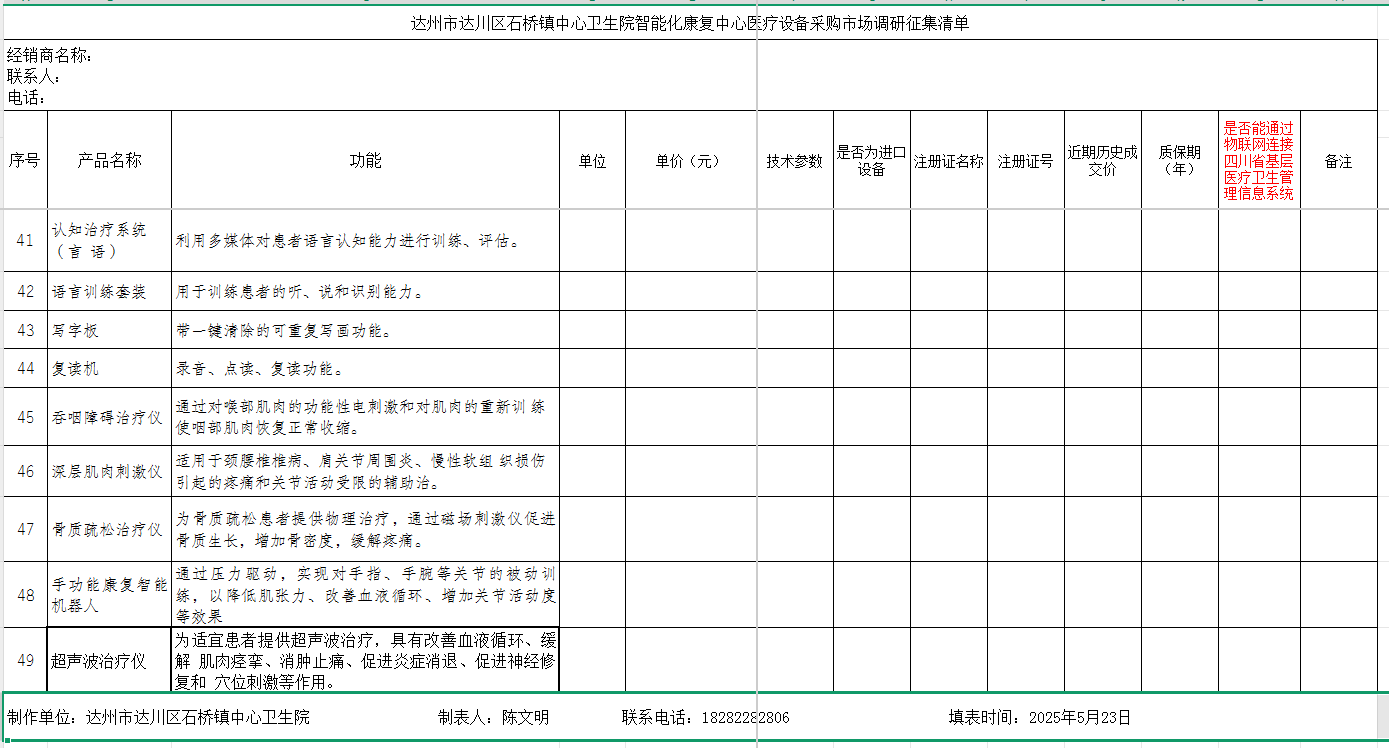 达州市达川区石桥镇中心卫生院智能化康复中心建设拟采购一批康复医疗设备,现面向全社会公开征集调研该批设备相关信息资料,欢迎相关企业积极参与,公示时间:2025年5月25日至5月29日。